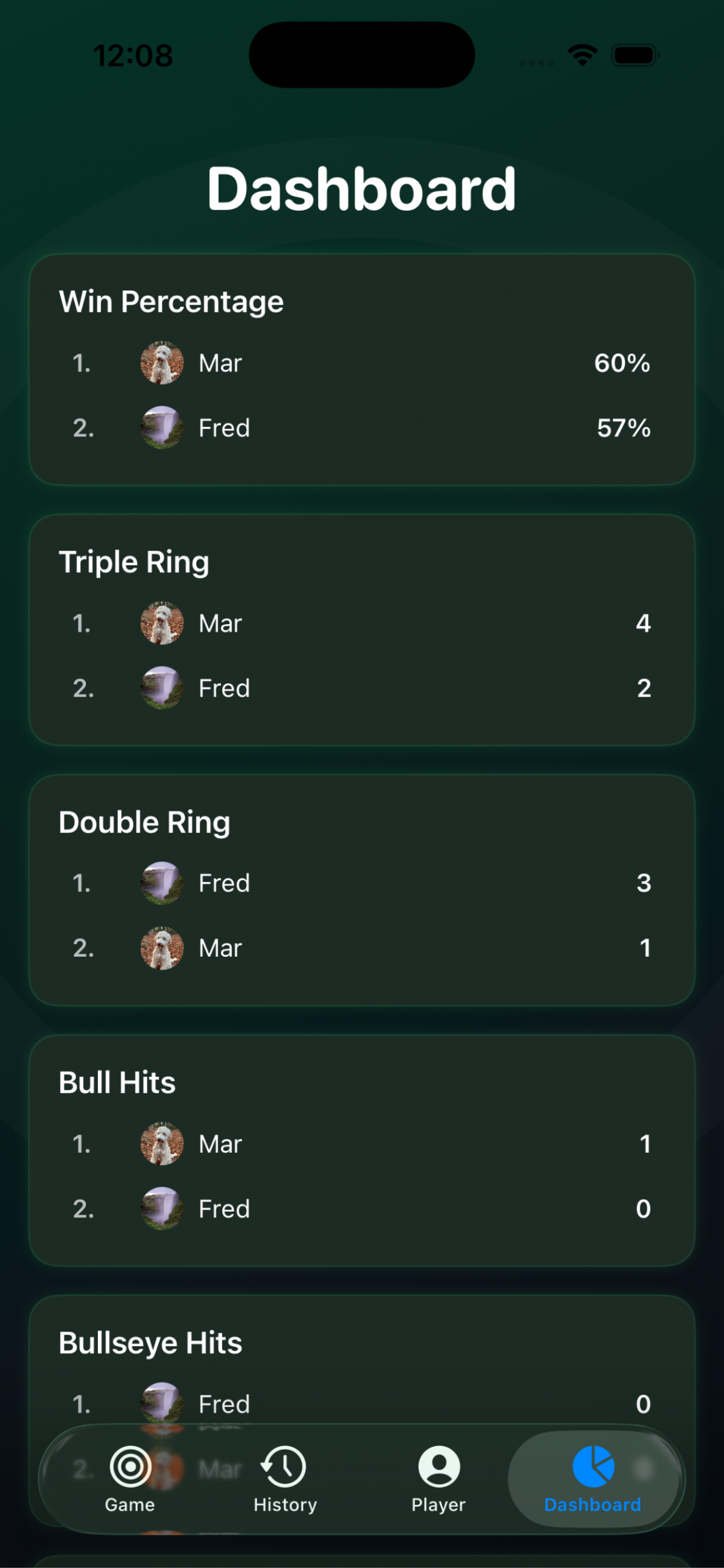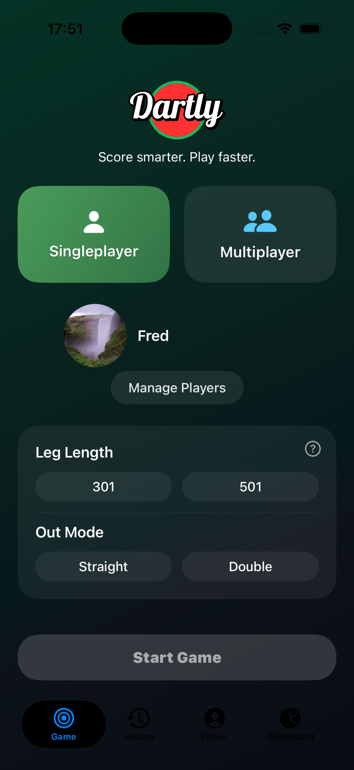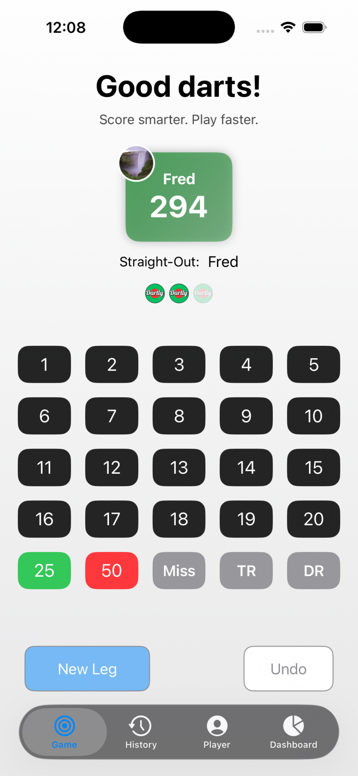 Mit Dartly kannst du ganz einfach Spieler auswählen, deine Würfe zählen und dich auf das Spiel konzentrieren.